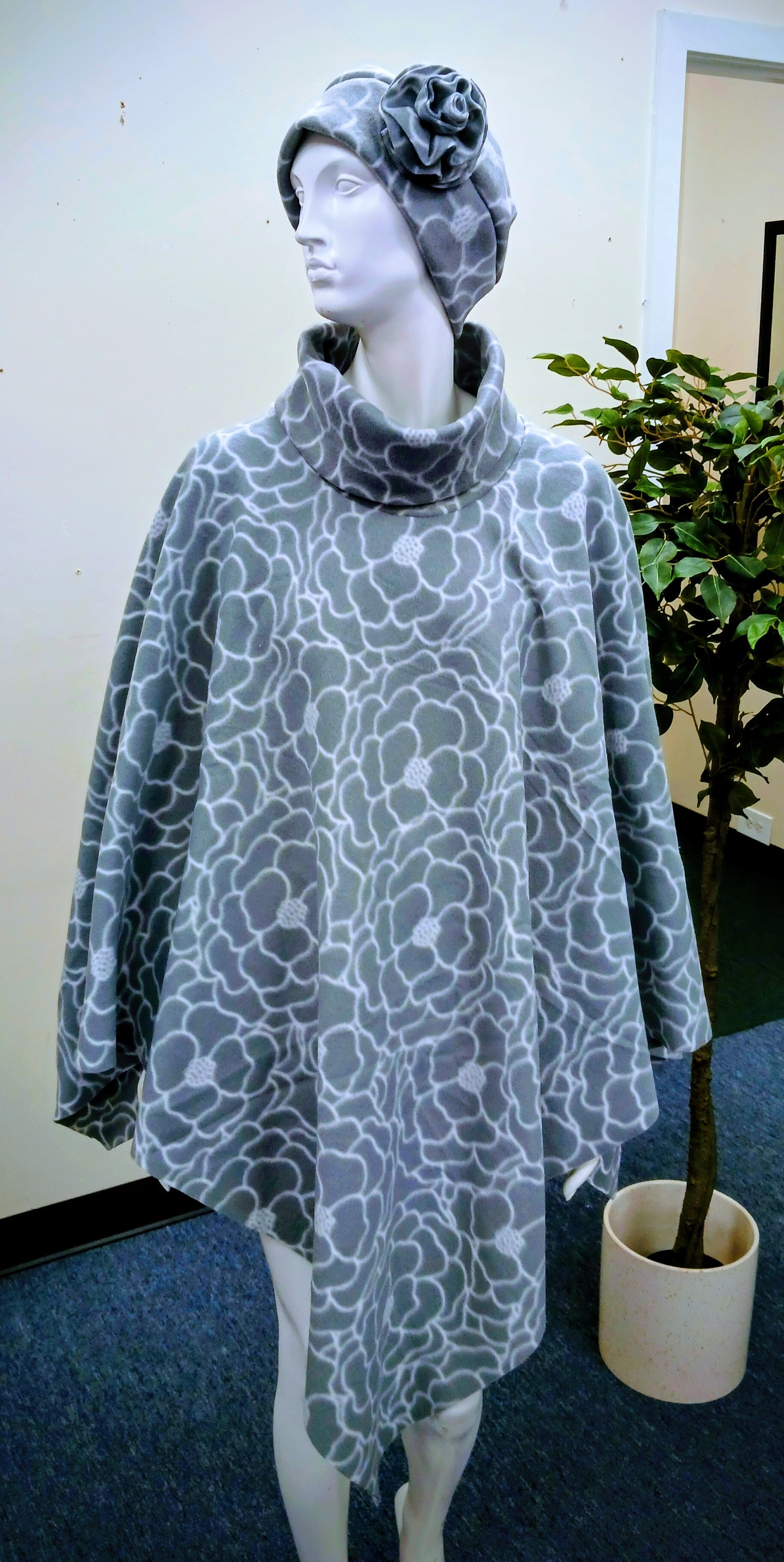 Grey & White Floral Poncho with Matching Hat- Elegant Women's Formal Wear